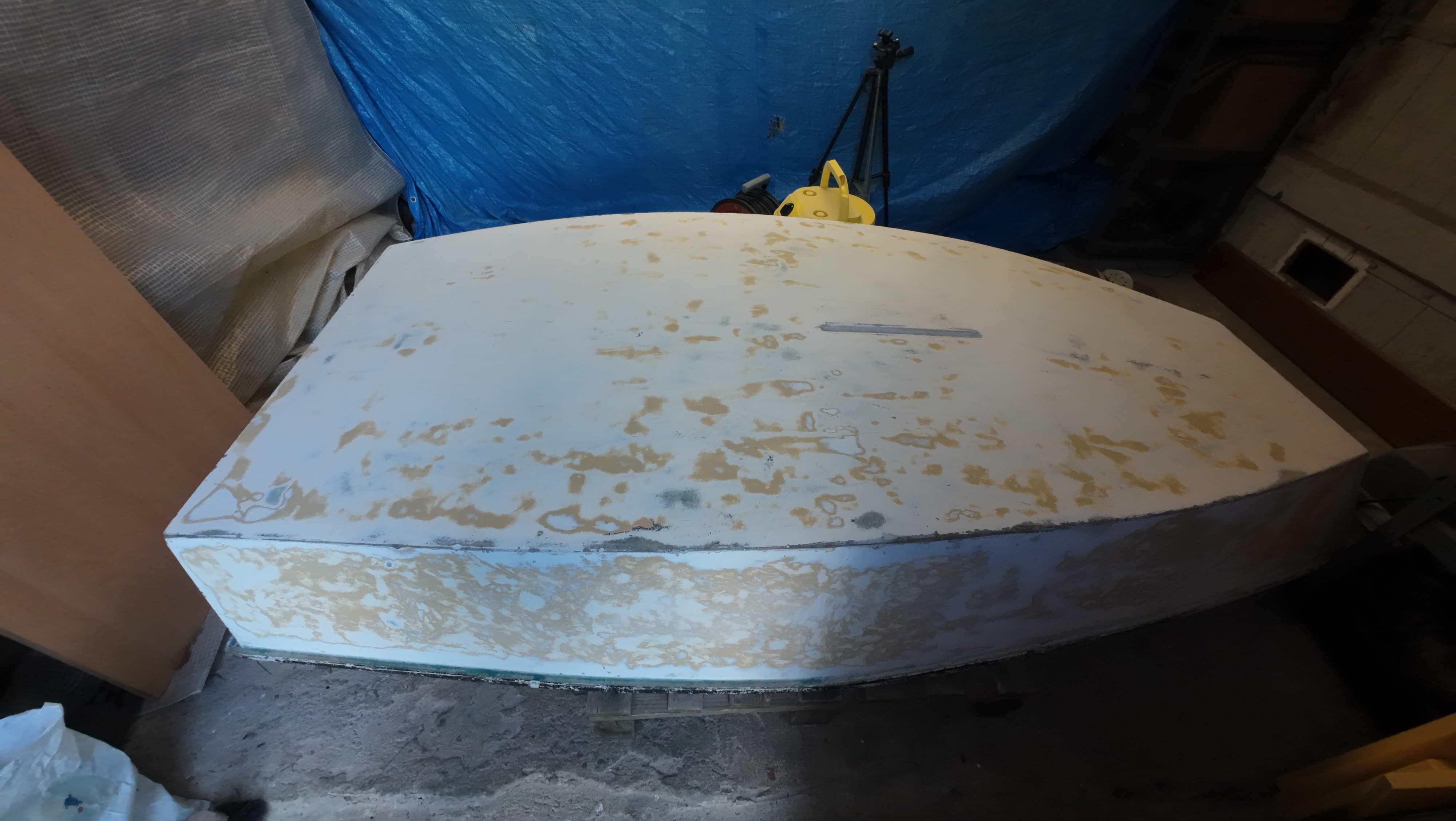 La coque du bateau a été récupérée dans un mauvais état, il a fallu la poncer entièrement
