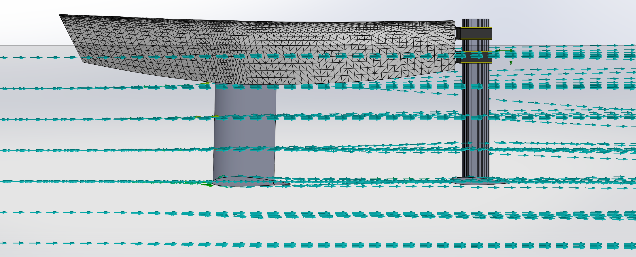 Simulation sur Solidworks avec Flow Simulation du bateau dans l'eau à une vitesse de 4nds